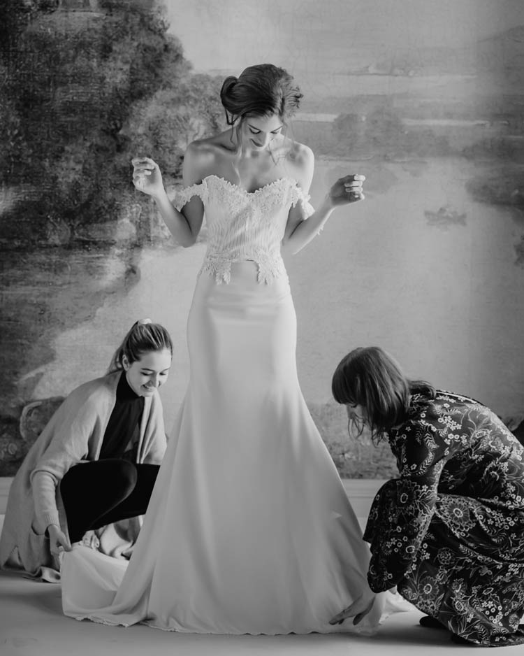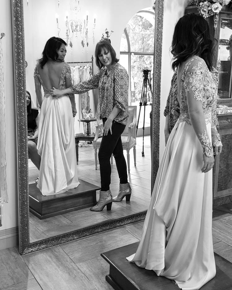Our fabrics are gorgeous - French lace, couture embroideries, silk charmeuse - we use only the finest materials from our exclusive mills. In preparation for your Virtual Appointment, we'll send swatches of your favorite dresses (up to 3) so that you can see and feel in person as we show you the gowns online.