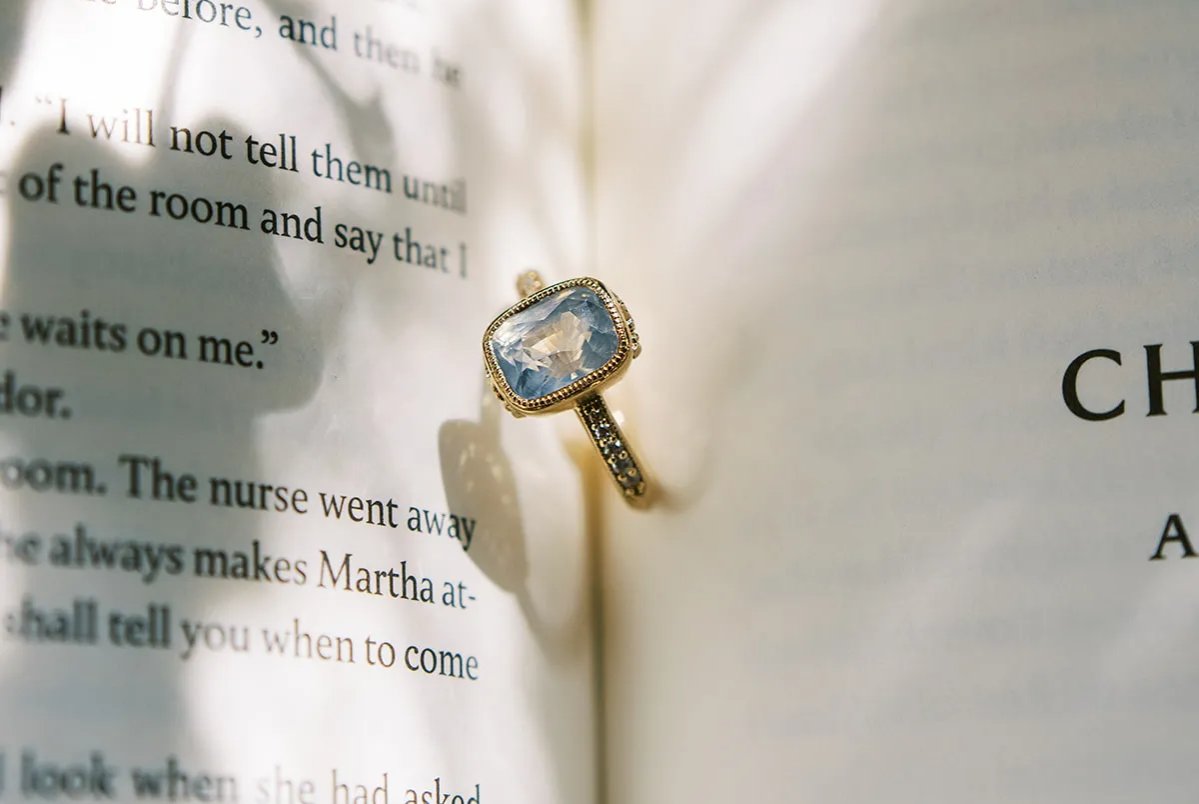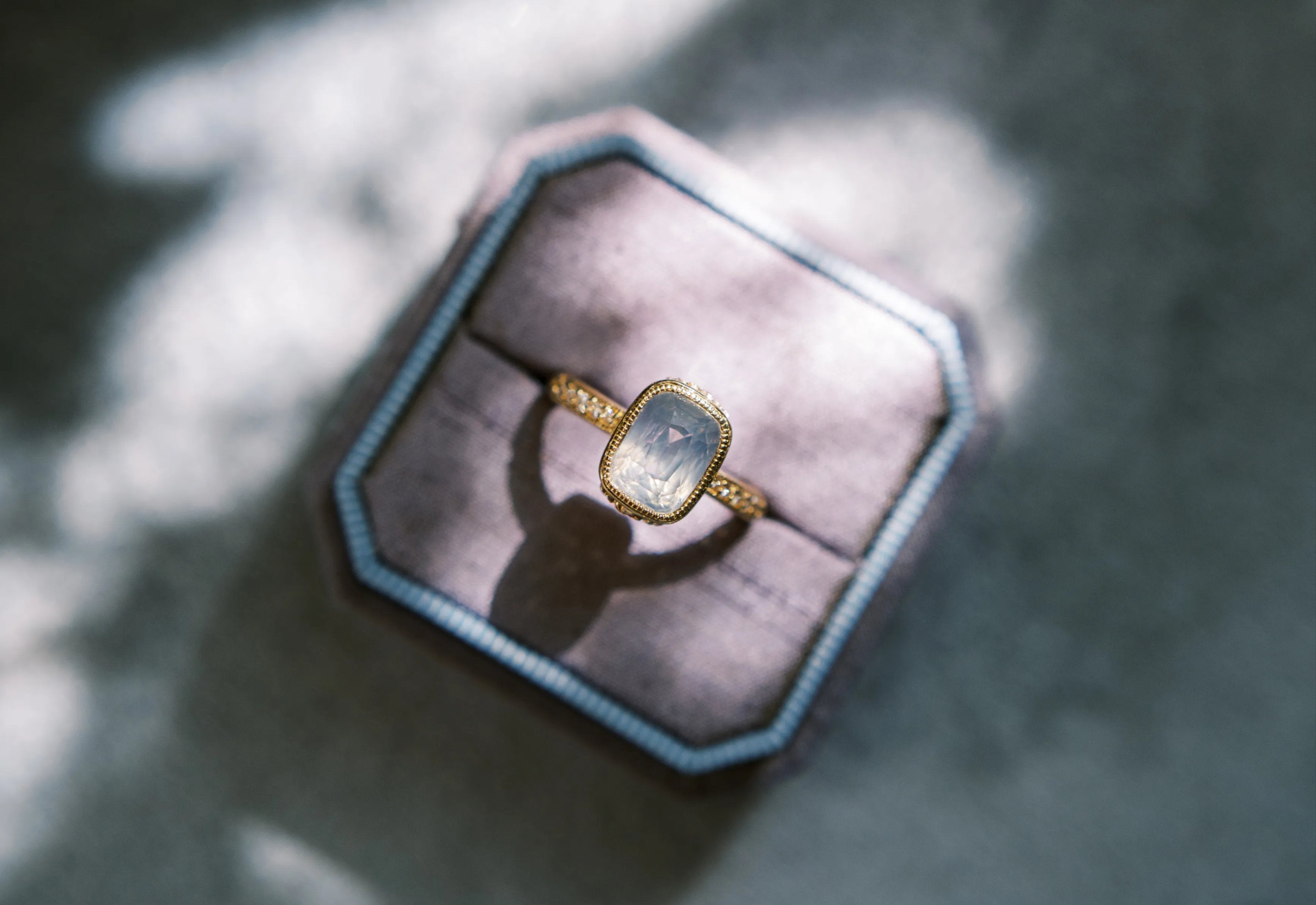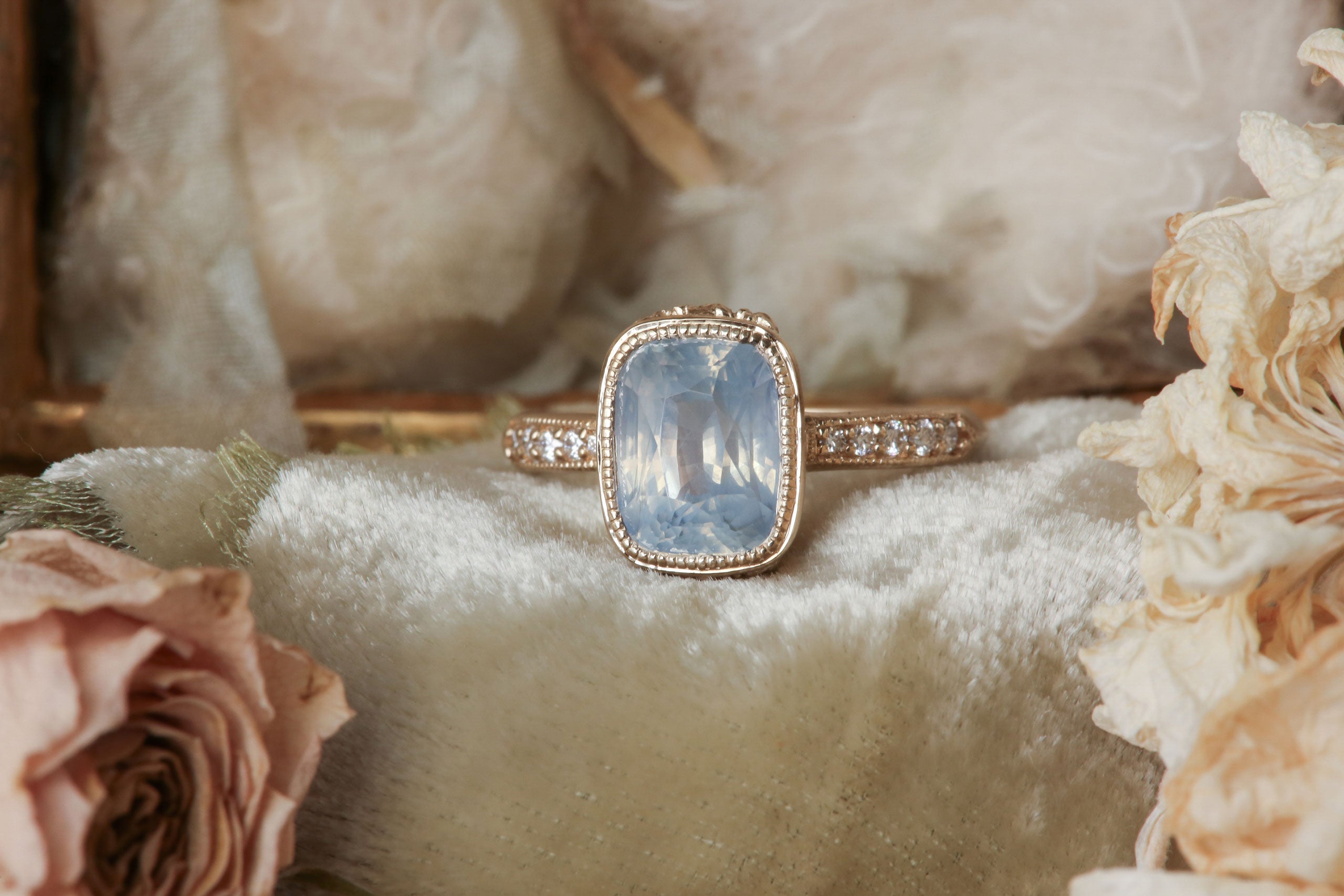 Discover the breathtaking beauty of the Aurélie natural sapphire and diamond ring. Handcrafted in collaboration with The North Way Studio, this gilded ring features a faintly opalescent center sapphire with threads of pale yellow and white resulting in a silky refraction.