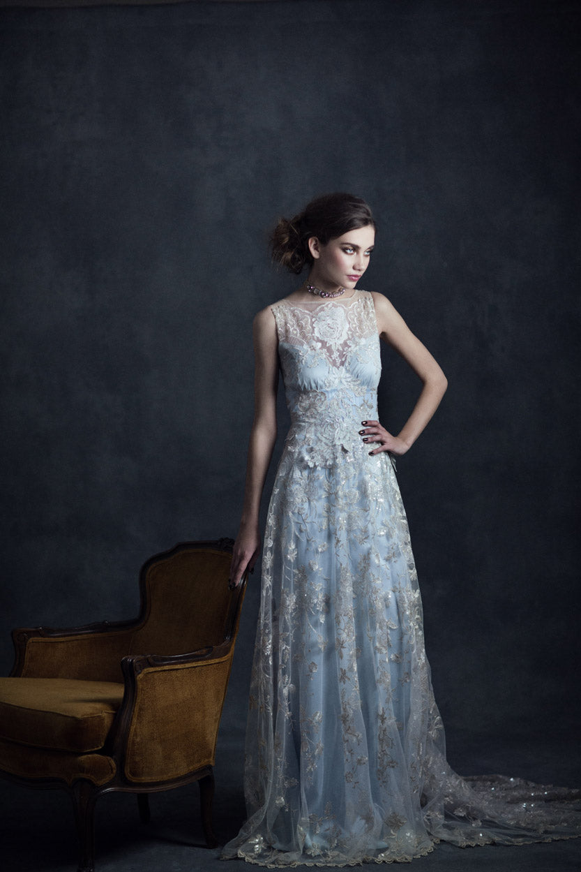 The Eden bridal dress is available as shown in Champagne with blue silk, or other silk options are available.