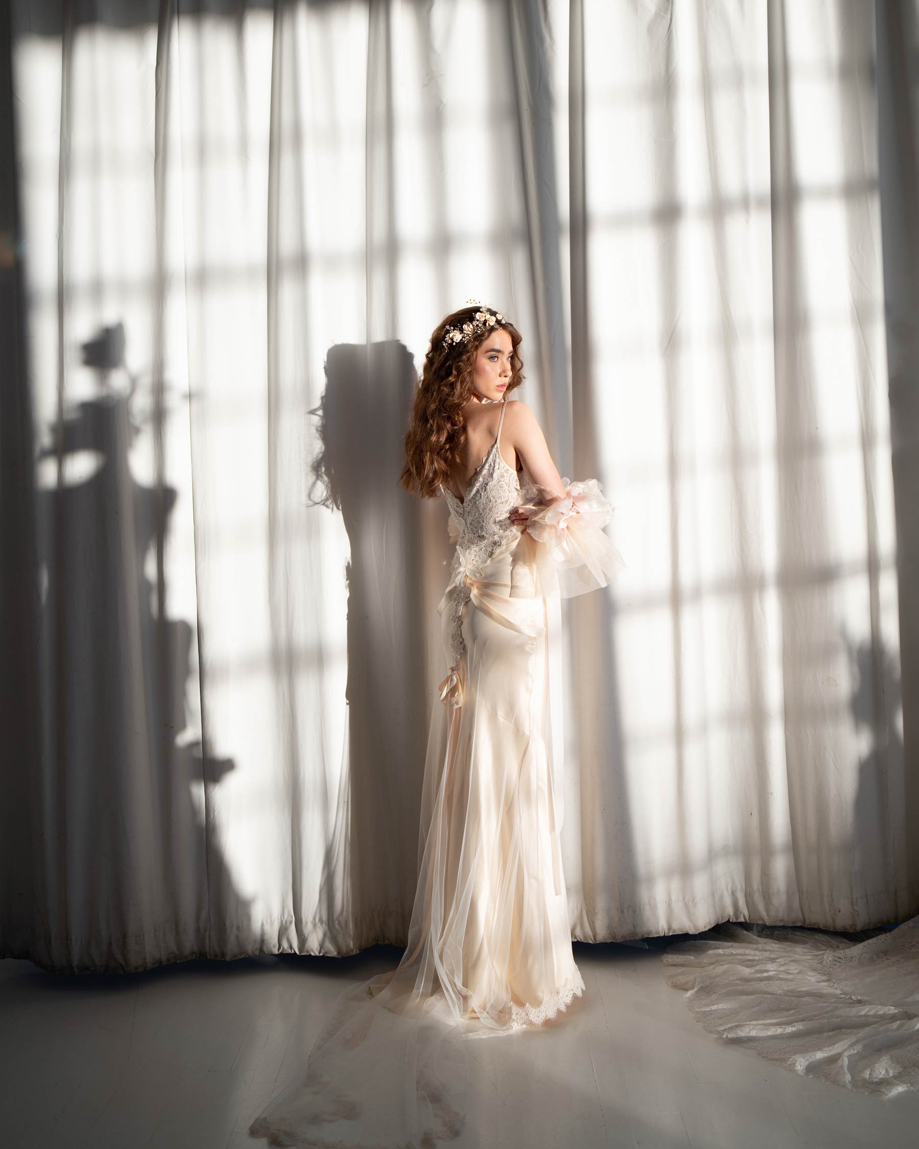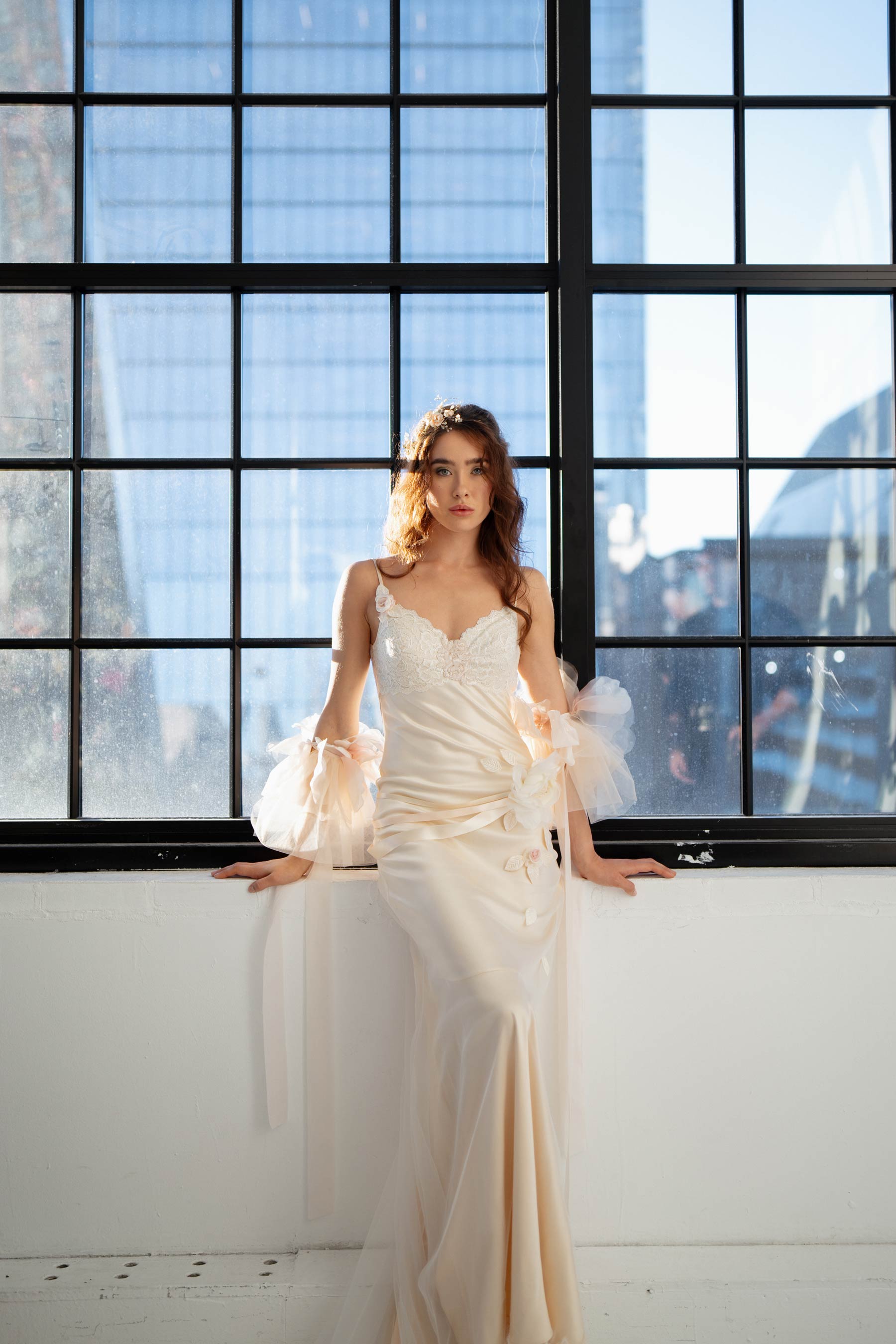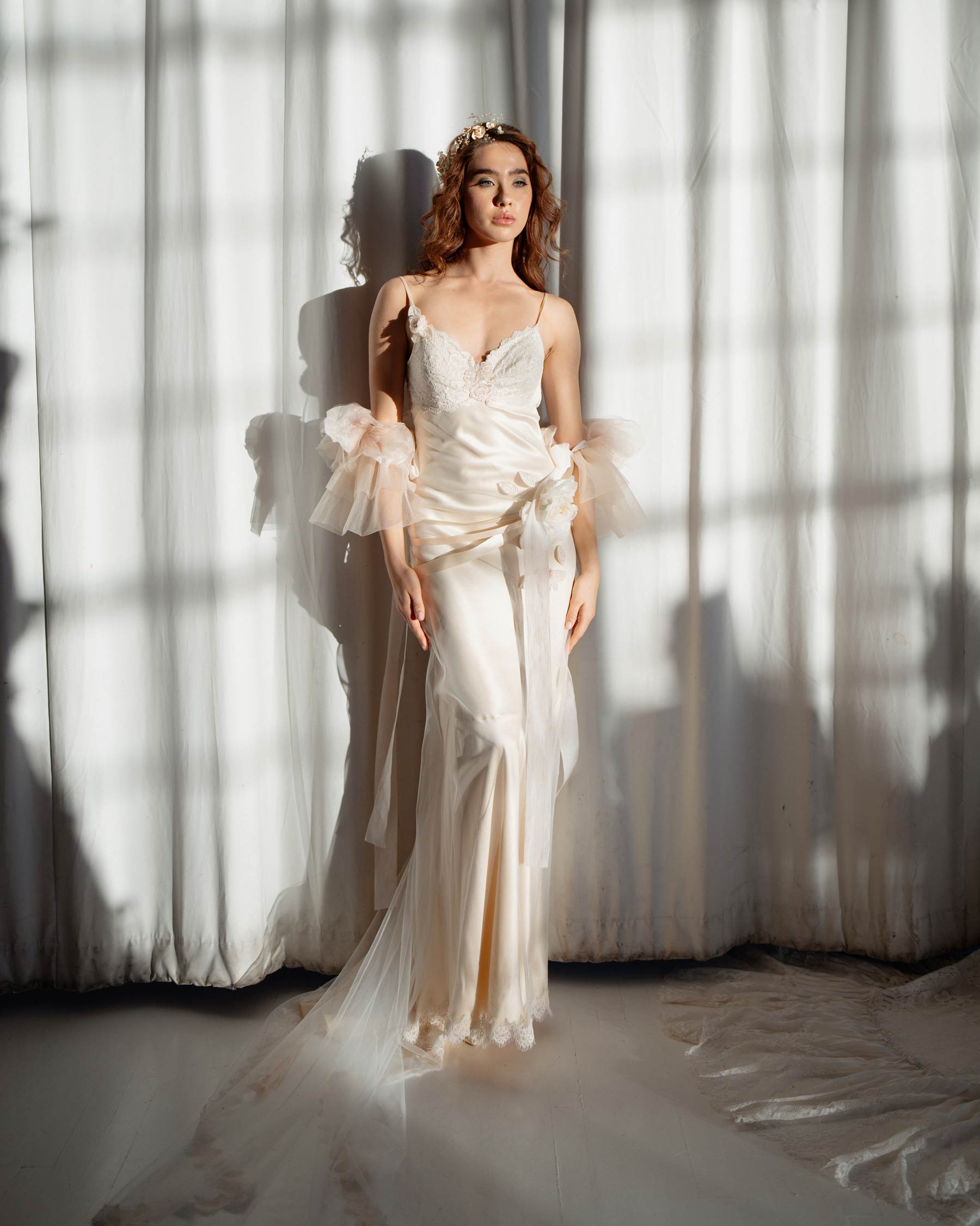 The fluid fit-to-flare silhouette follows the body, allowing pure silk to move softly with every step. A sweetheart neckline meets a lace bodice that feels gently hand-placed rather than structured. Silk ribbons, flowers and drifting petals gather and drape, adding a sense of organic beauty and movement.