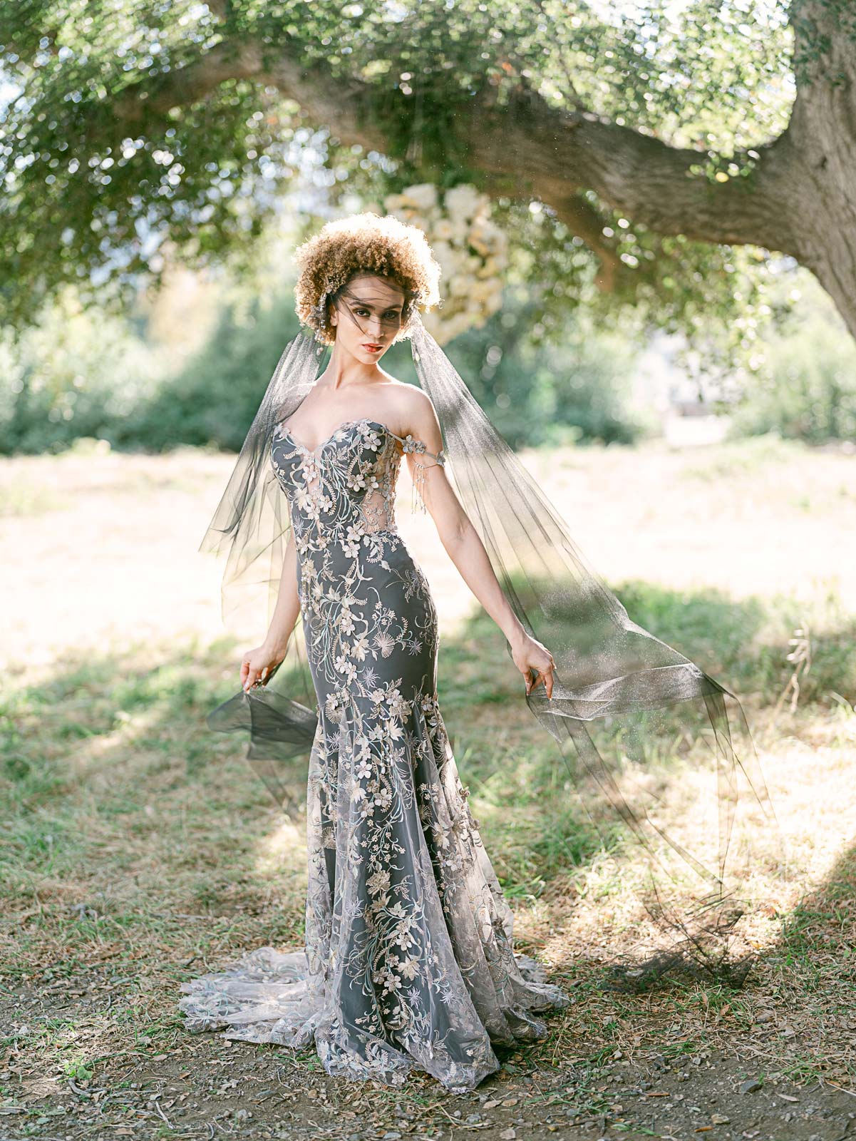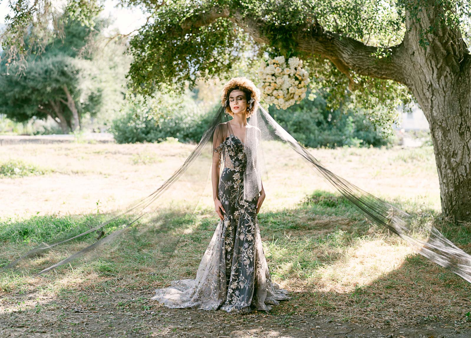 Imagine a shimmering golden meadow in full bloom and you have Lunaria from the Moonlight Reverie Collection. This softly structured corset bodice has sheer insets and leads to a fit and flare silhouette embroidered with stunning 3-D flowers and draped pearls. Muted colors of mauve, teal, champagne, and shimmering gold are intertwined in a graceful floral motif. Worn with the Crescent black tulle veil draped in a cascading cage veil style with floral appliques and draped pearls adorning the sides.