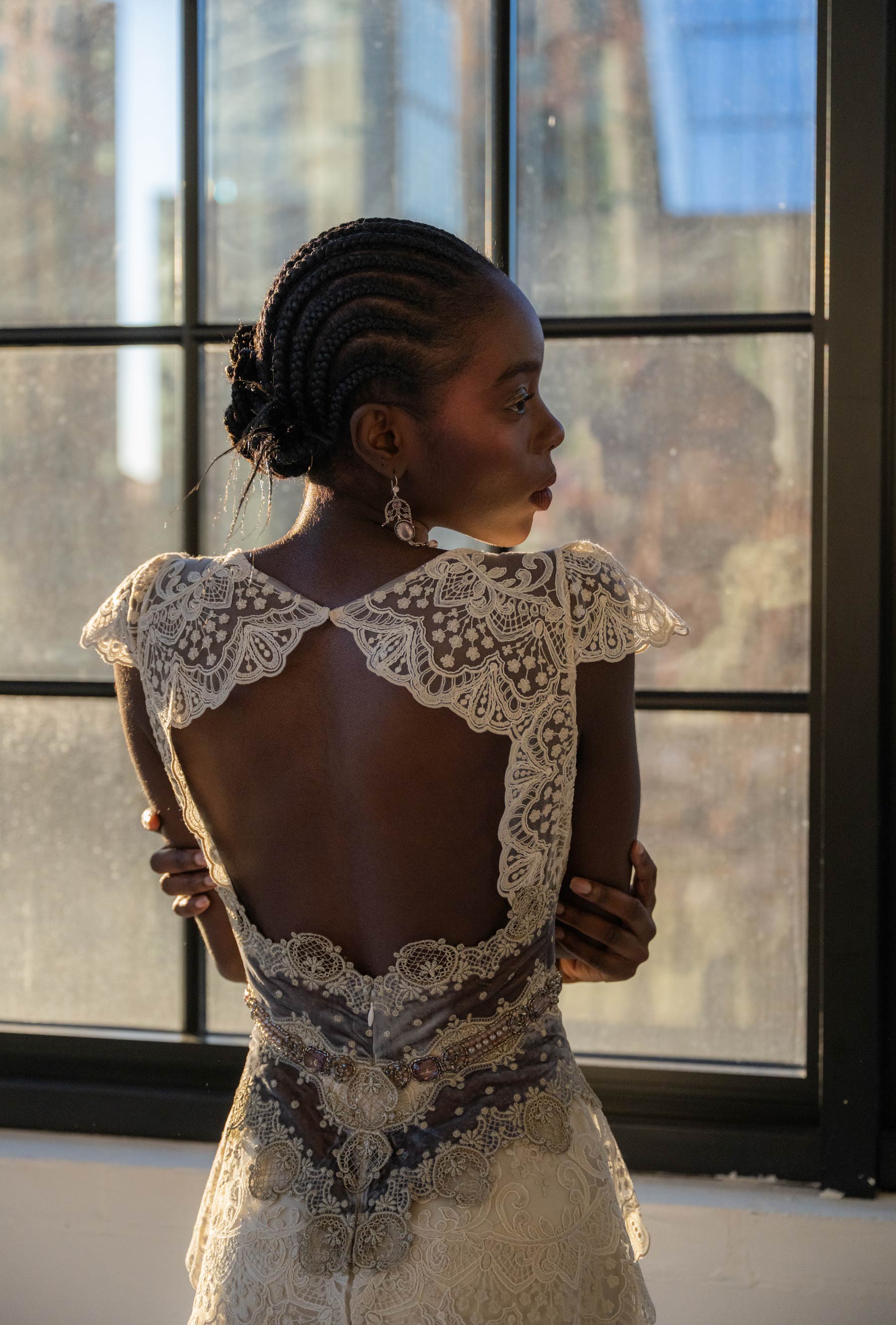 From the waist, the gown unfolds into an elaborate train layered with embroidery that feels ceremonial without excess. Despite its richness, Memory moves effortlessly, striking a balance between grandeur and ease for the bride who appreciates craftsmanship, history, and beauty that endures. Shown in Ecru with Platinum silk lining. Custom waist details available, with linings offered in our silk color options.