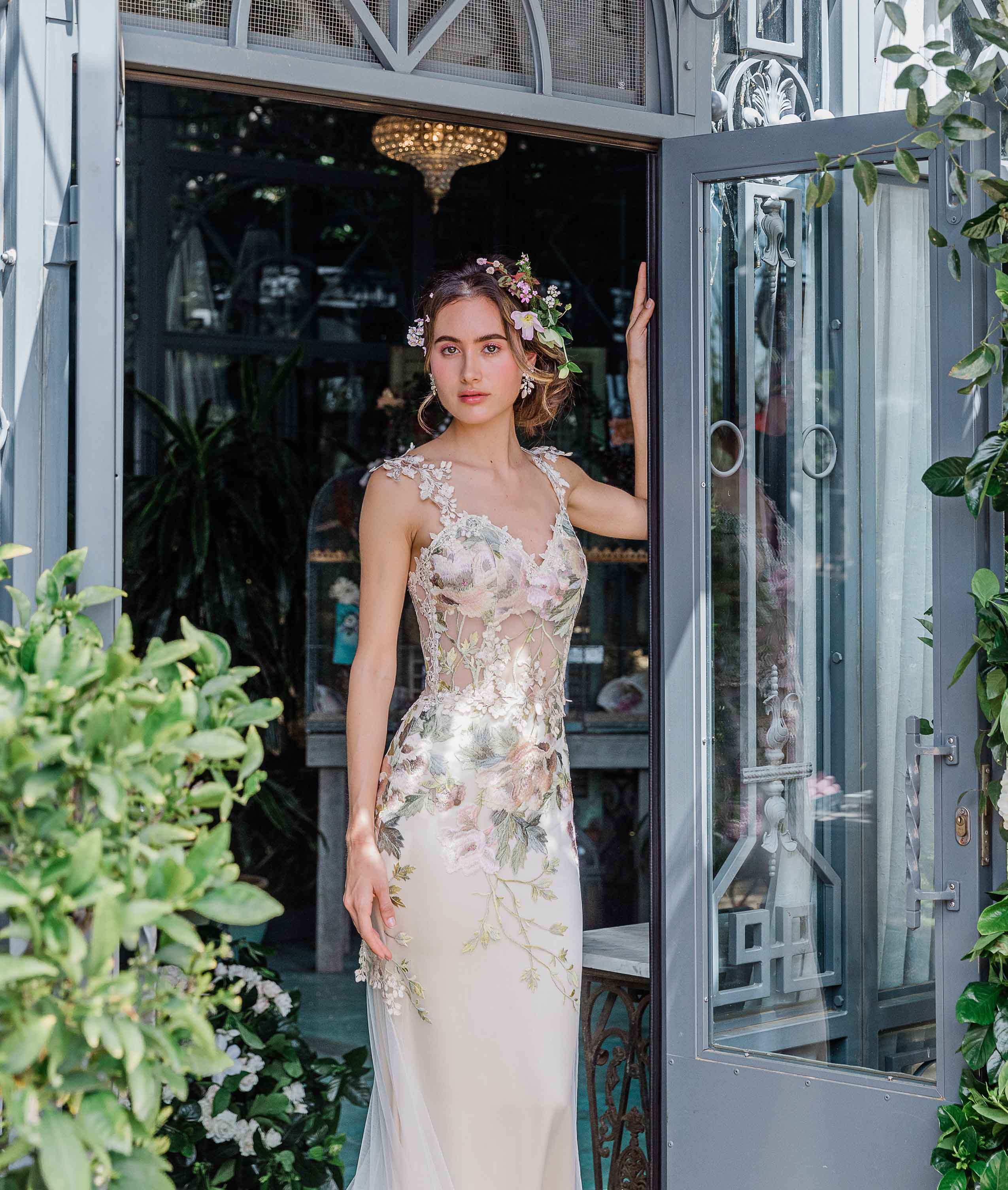 Flowers bloom in her footsteps. Nature inspired dresses designed for a floral wedding Goddess.