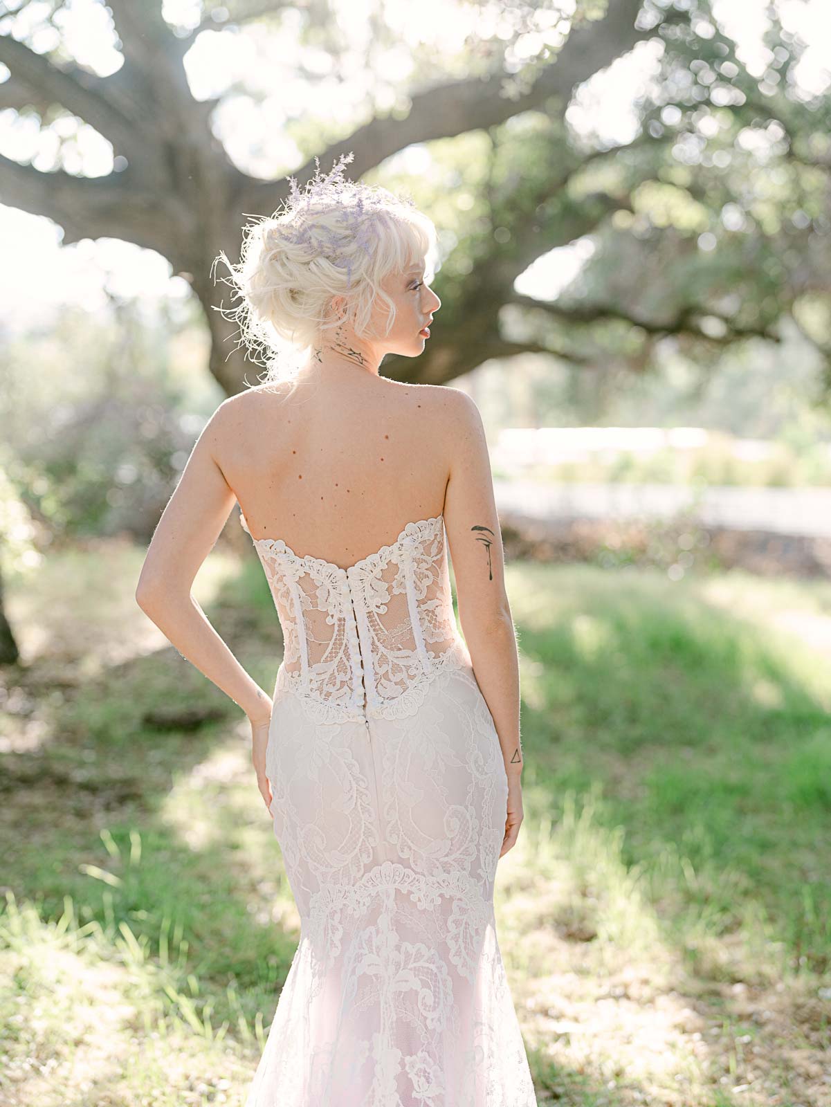Classic with a twist. Our strapless French Solstiss lace fit and flare sheath is a gorgeous timeless piece from the Moonlight Reverie Collection. Add a gradient silk underneath, and Quill becomes unforgettable. The scalloped hem and long train are lined with crinoline to give the light-as-air dress just a bit of drama, and the sheer, button back with softly structured corset bodice enhances your silhouette. Shown with the Everglade long sleeve bolero, Quill is giving all the forest fairy vibes!