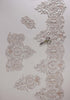 Talk about opulence! This rich embroidered trim features scrolling leaves and scalloped edges in threads of platinum rayon and metallic rose gold. Measuring approximately 11” at the widest point, and 5” at the narrowest, the pattern can be cut into various emblems, or used as running yardage. This trim is available in increments of 3 yards.