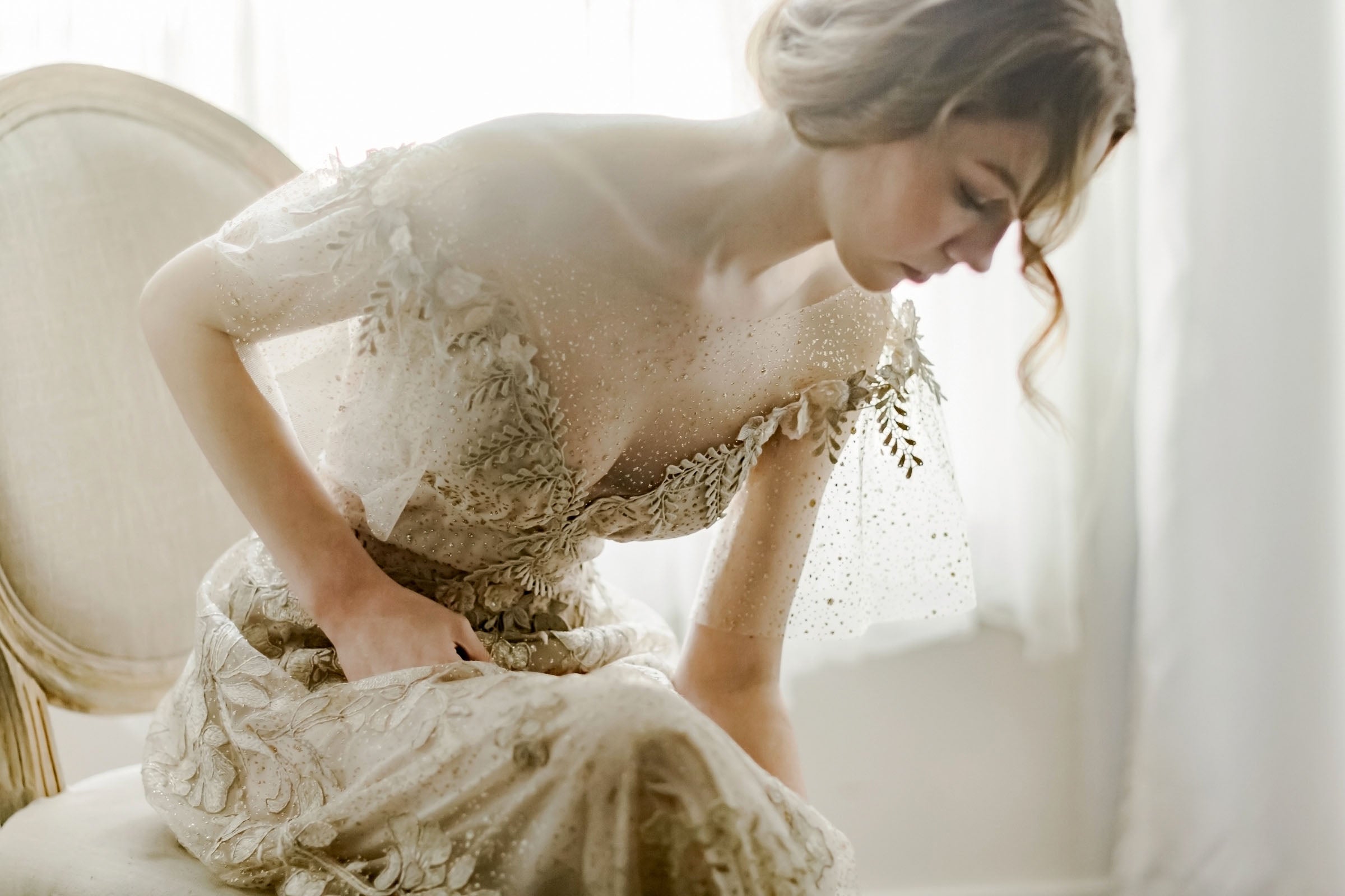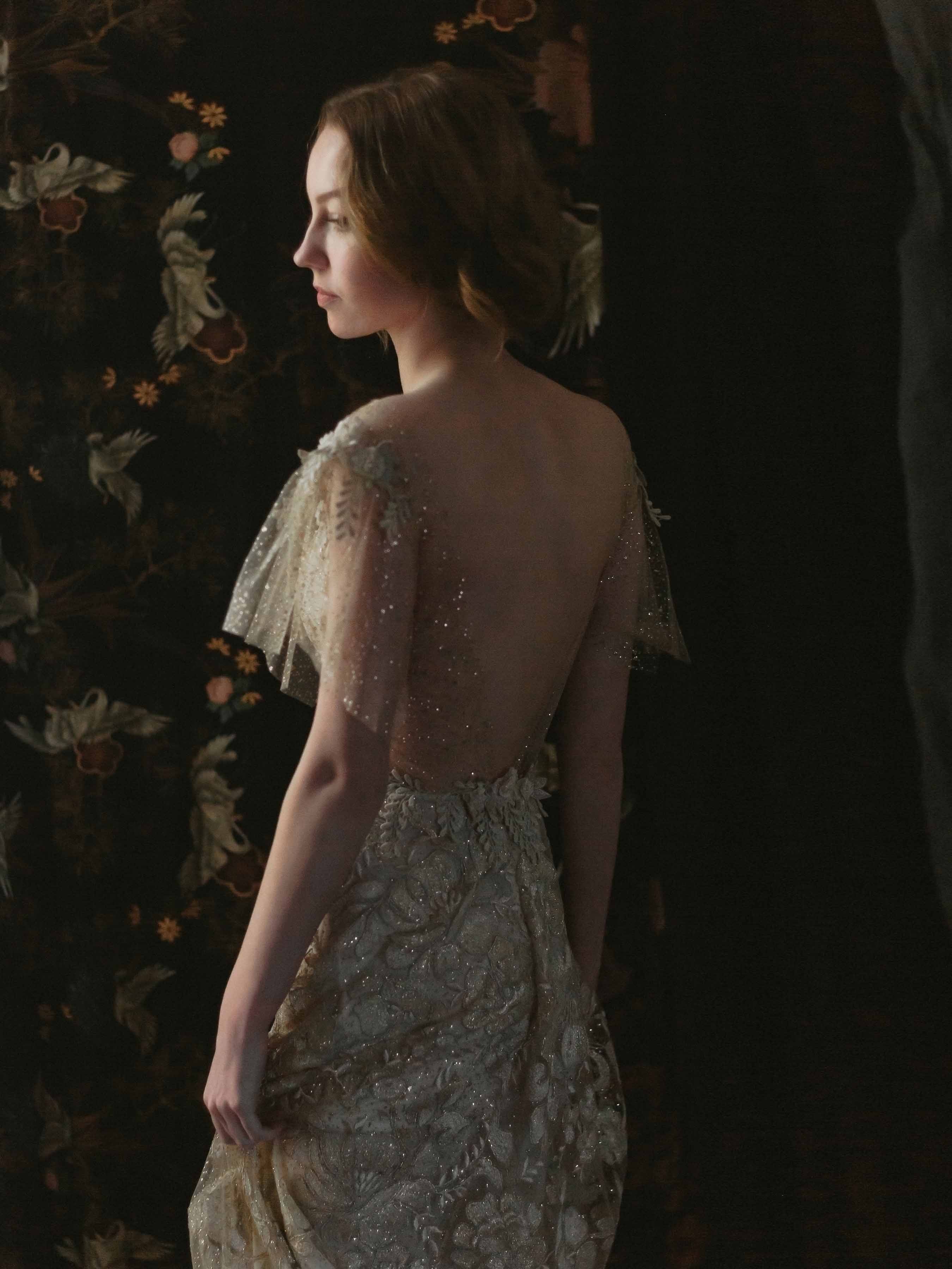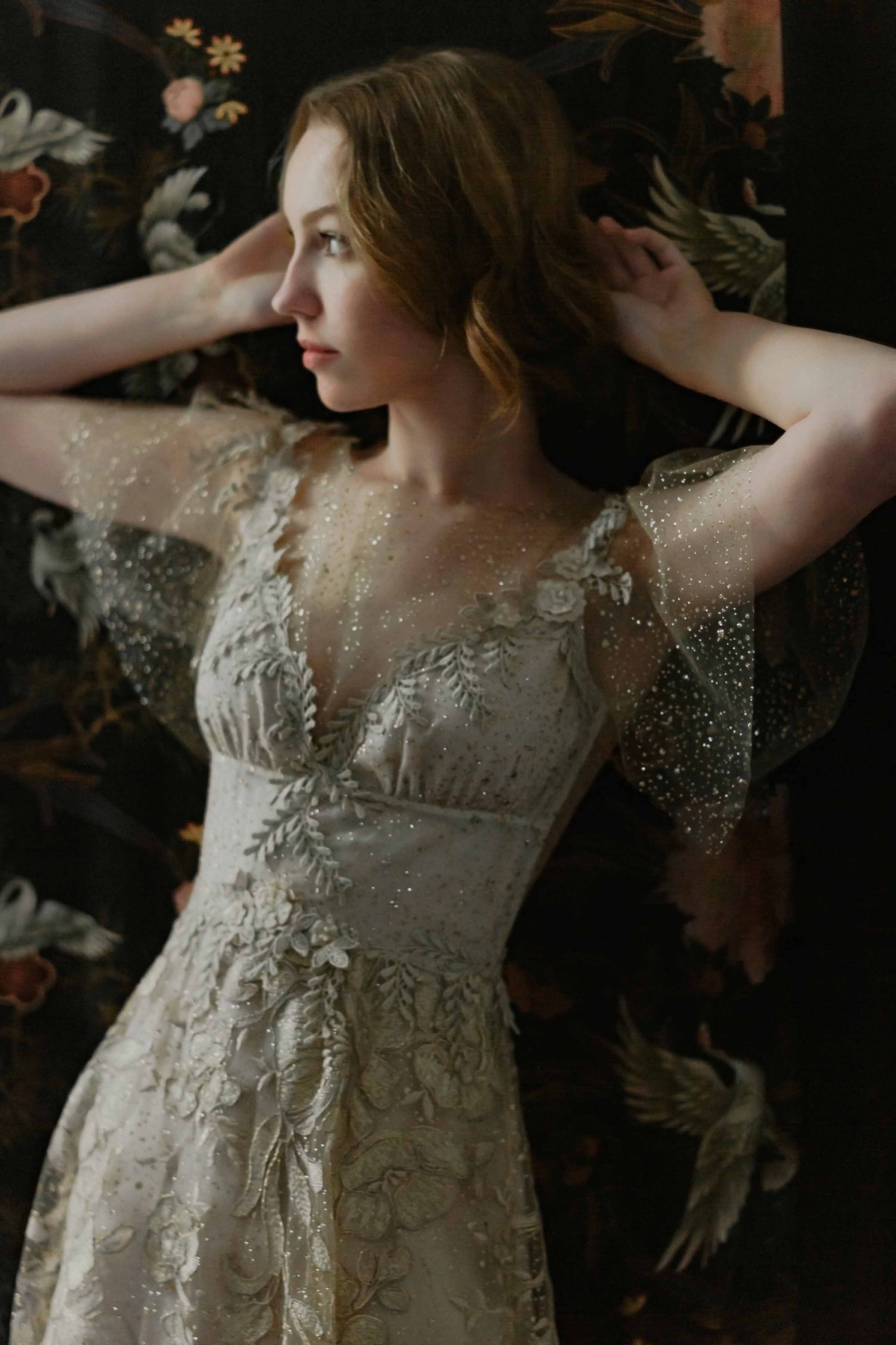 Shimmering like sunlight, our Soleil couture wedding dress from the Evolution Collection casts an enchanting spell. Made of intricate French embroidered tulle generously sprinkled with glistening sparkles, the floral motif trails along the skirt and bodice to an almost off-the-shoulder illusion neckline with graceful flutter sleeves and a deep V-neckline. The back features just a sheer layer of sparkles framing an open back trailing to a vine trimmed train. Lined with chiffon, and pictured with a short nude under-layer so that the skirt appears slightly translucent, you also have the option of a full lining for the skirt.