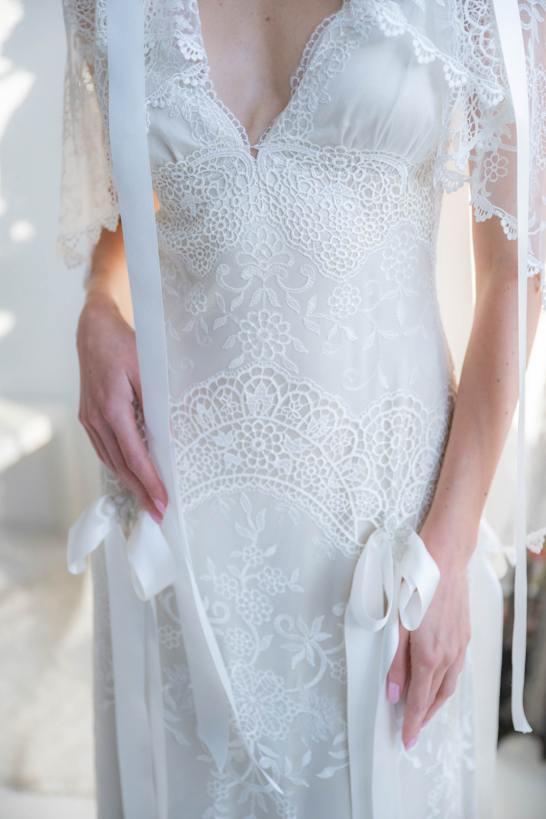 The soft A-line silhouette skims the body in silk and features an iconic French embroidery pattern of scalloped Guipure motifs. A deep V neckline is framed by delicate lace cap sleeves, while a plunging open back reveals sheer tulle flowing into a graceful train. Intricate embroidery adorned with silk ribbon bows adds dimension and movement throughout.